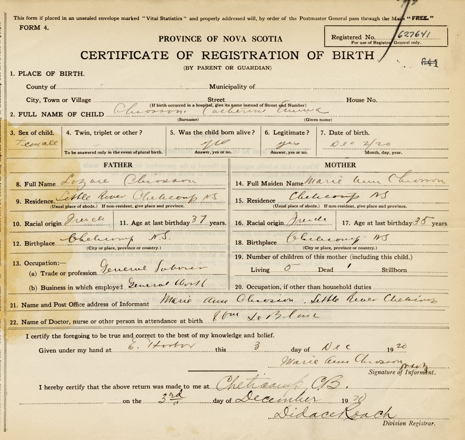 21. Name and Post Office address of Informant Marie Ann Chiasson Little River, Cheticamp