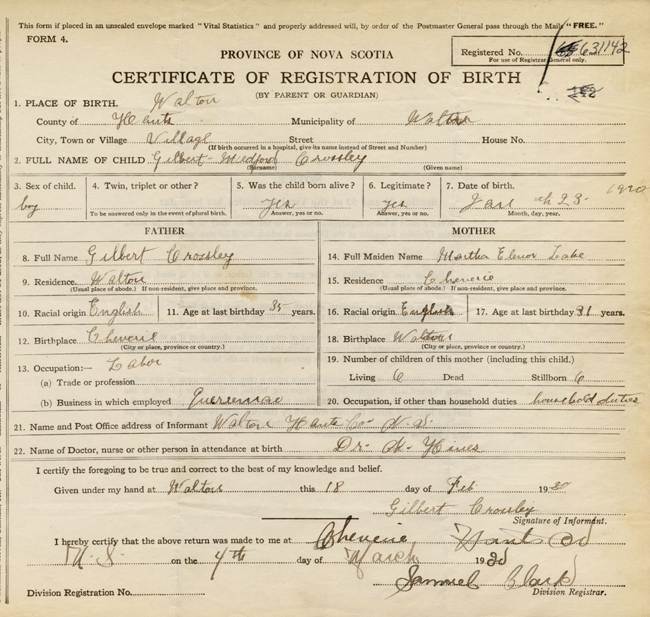 21. Name and Post Office address of Informant Gilbert Crossley Walton, Hants Co.
