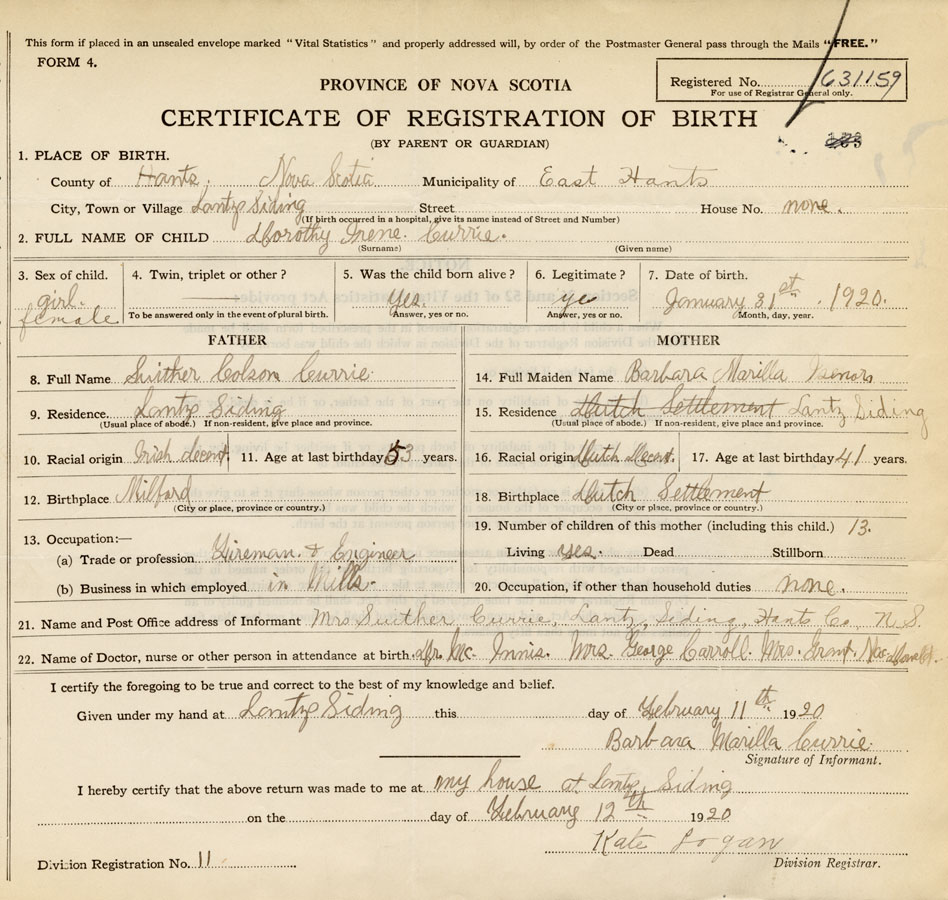 21. Name and Post Office address of Informant Barbara Marilla Currie Lantz Siding, Hants Co.