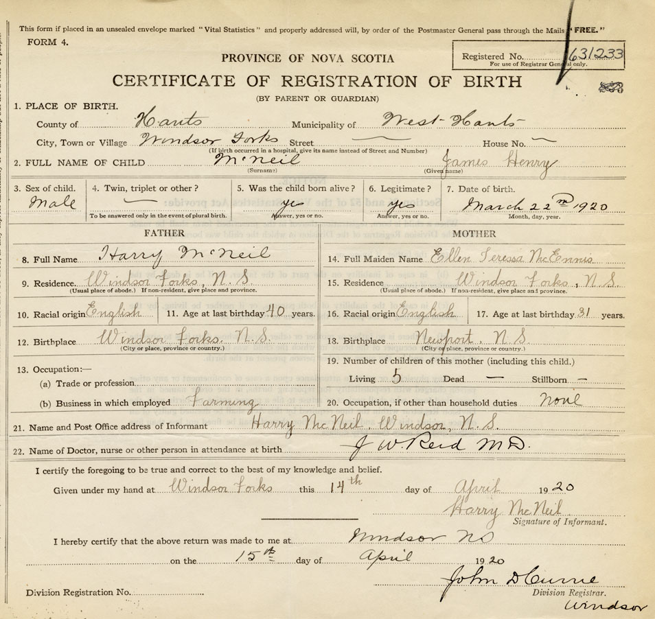 21. Name and Post Office address of Informant Harry McNeil Windsor, Hants Co.