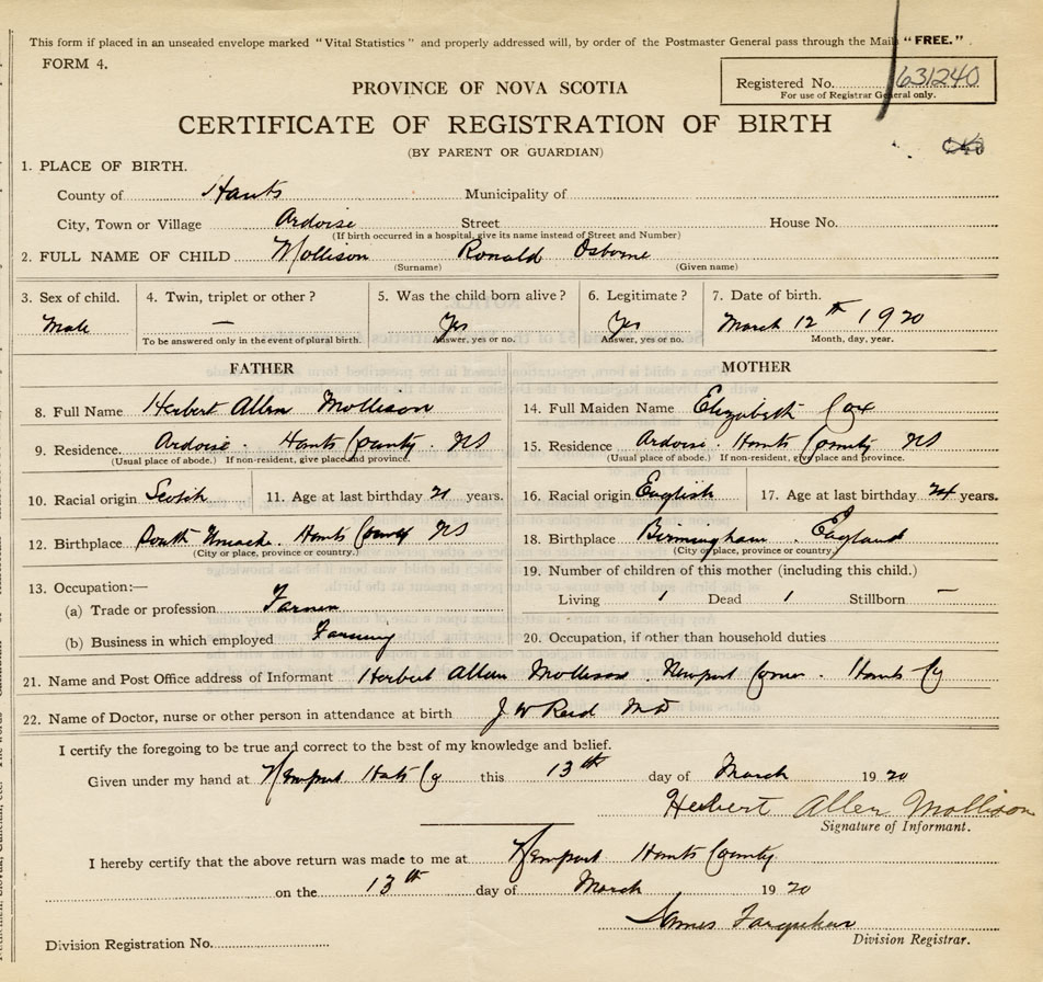 21. Name and Post Office address of Informant Herbert Allen Mollison Newport Corner, Hants Co.