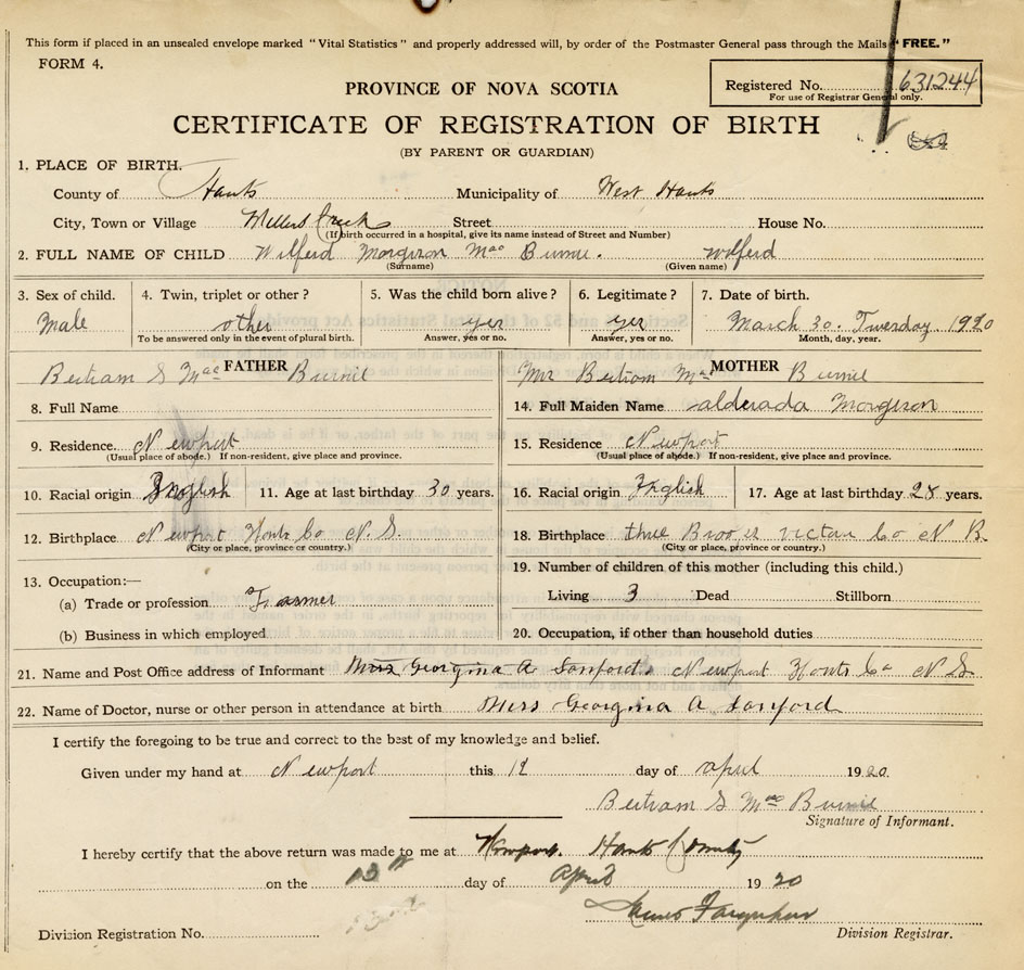 21. Name and Post Office address of Informant Burtram S. MacBurnie Newport, Hants Co.