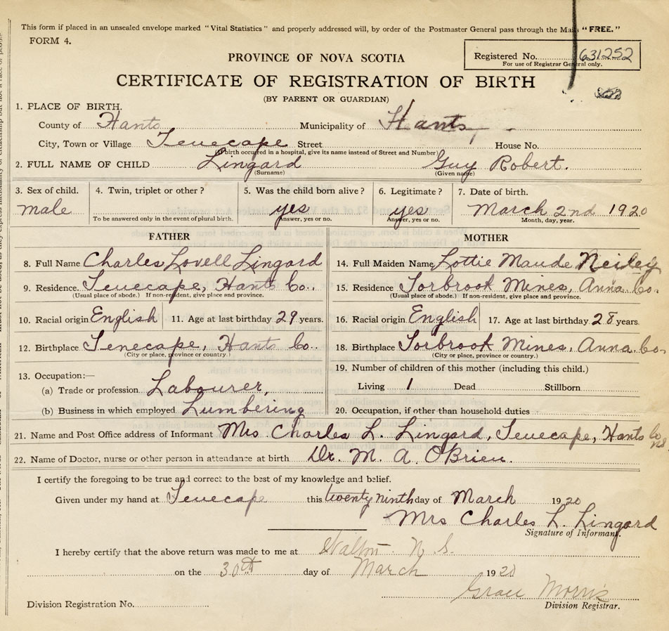 21. Name and Post Office address of Informant Mrs. Charles L. Lingard Tenecape, Hants Co.