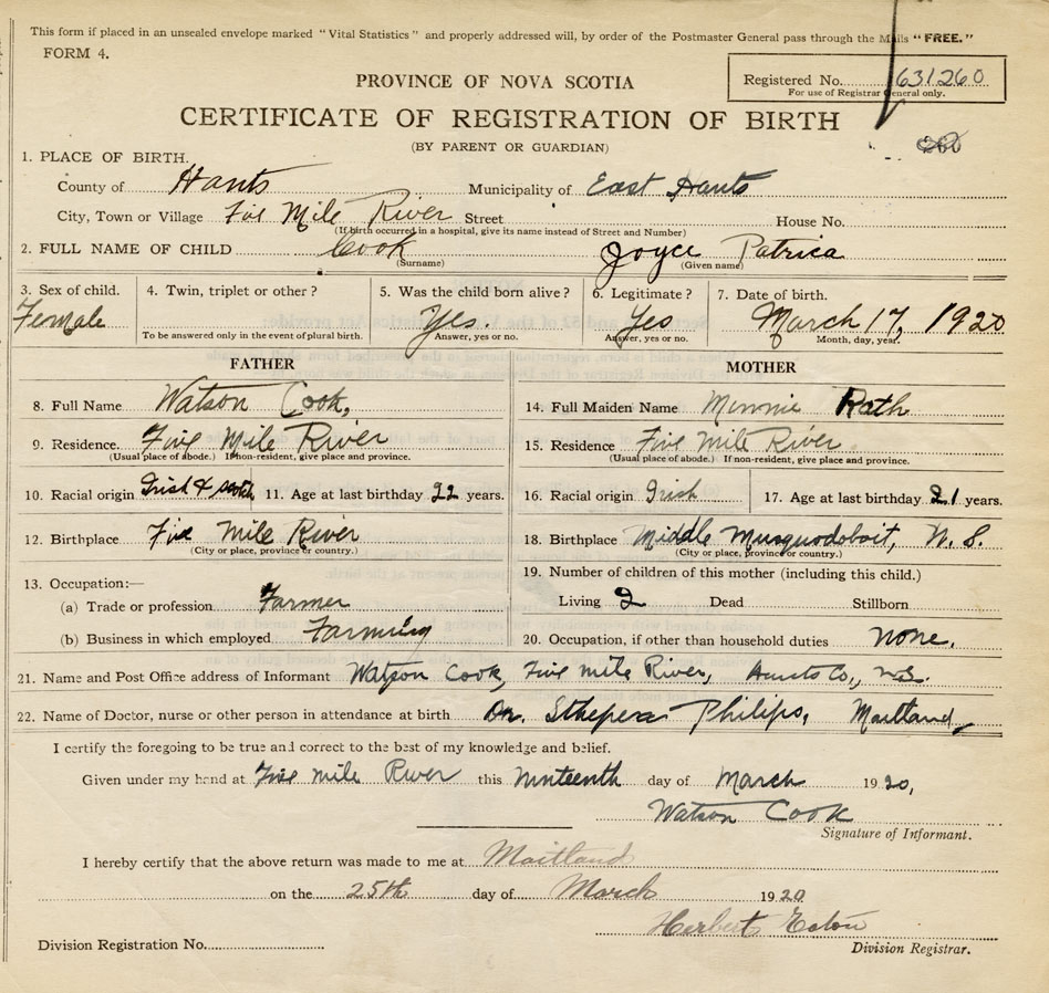 21. Name and Post Office address of Informant Watson Cook Five Mile River, Hants Co.