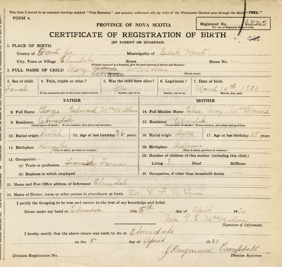 21. Name and Post Office address of Informant Mr.s G. E. MacMillan Elmsdale