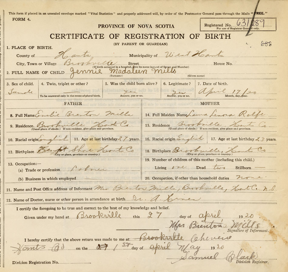 21. Name and Post Office address of Informant Mrs. Brenton Mills Brookville, Hants Co.