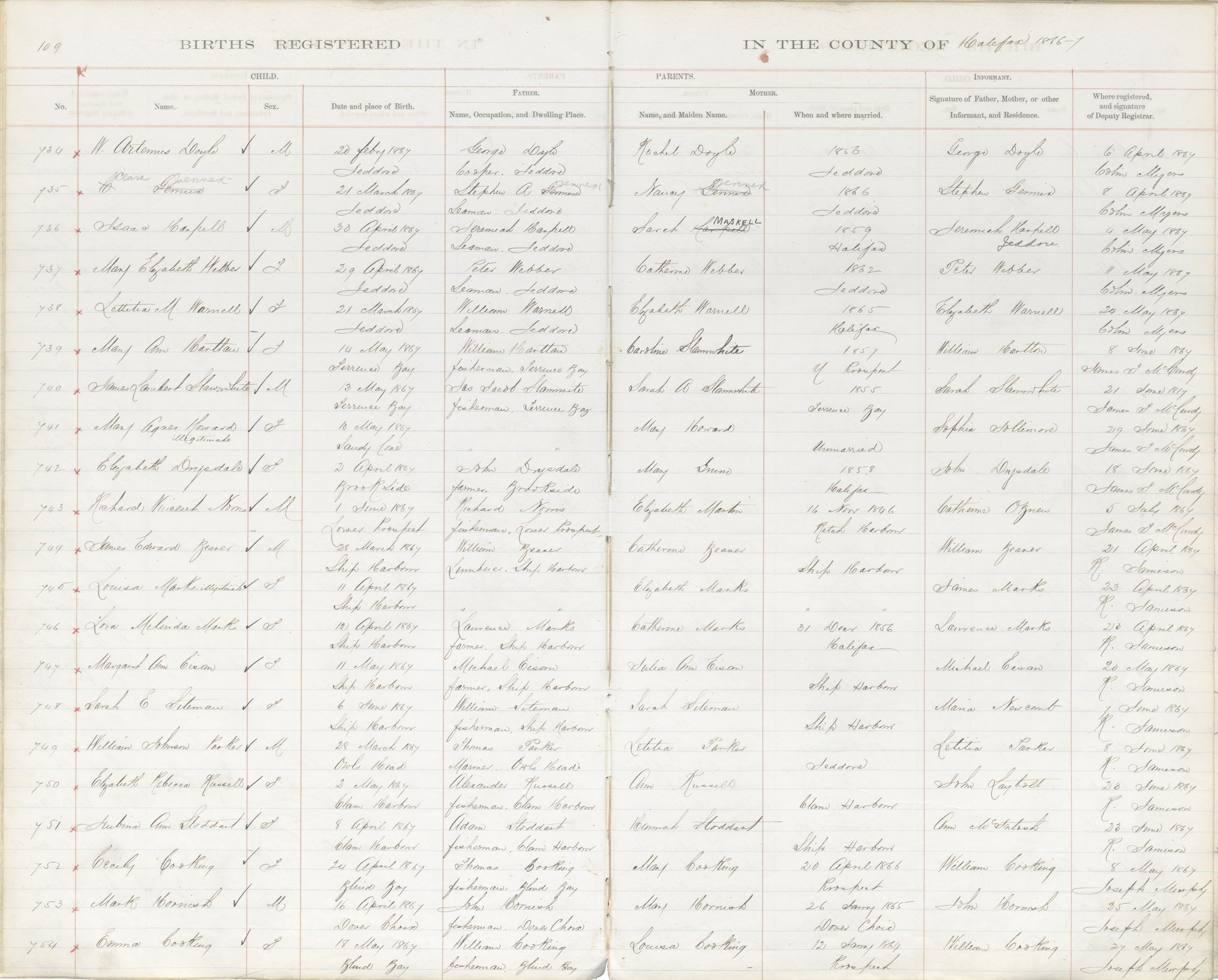 Birth Registration: Year: 1867 book: 1809 page: 109 number: 734