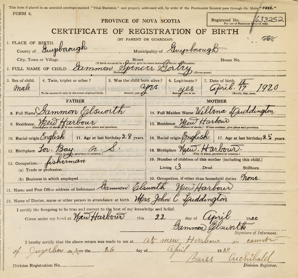 21. Name and Post Office address of Informant Gammon Elsworth New Harbour