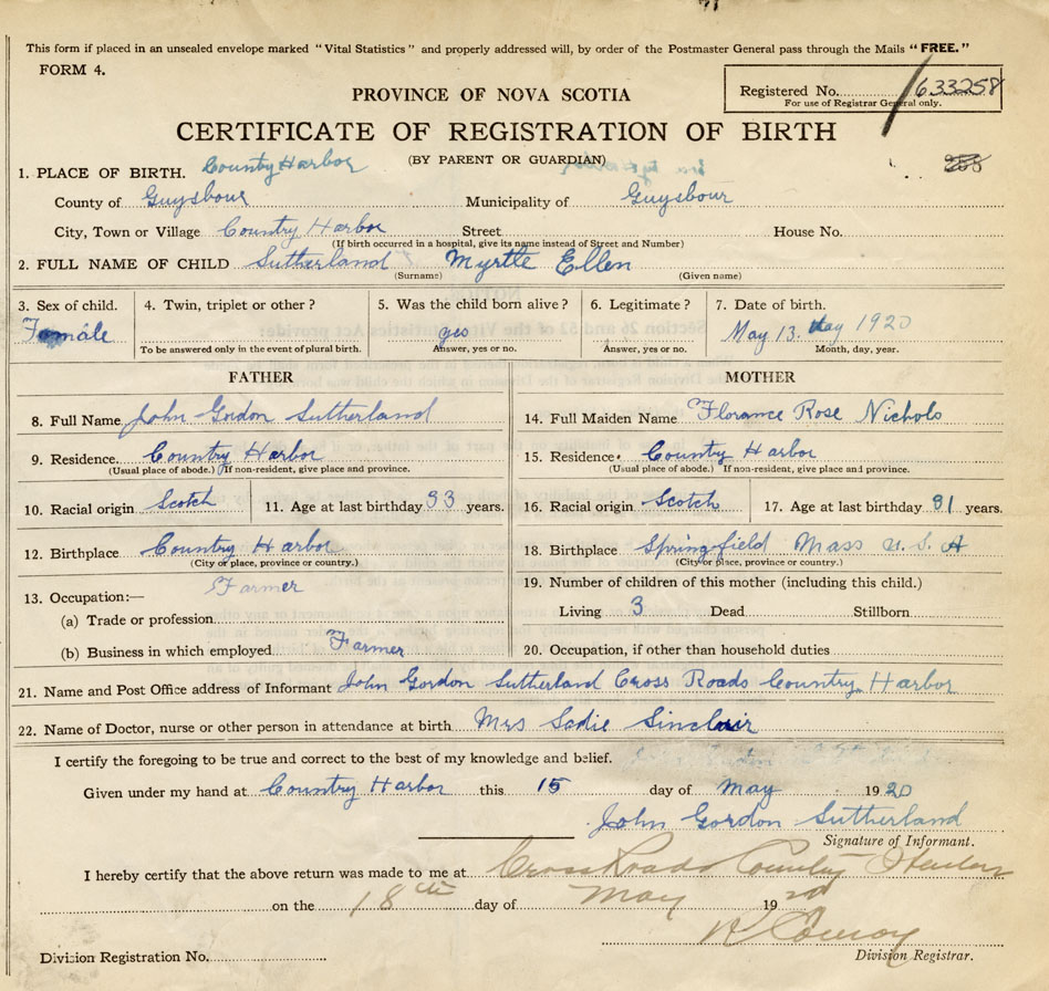 2. FULL NAME OF CHILD Sutherland, Myrtle Ellen