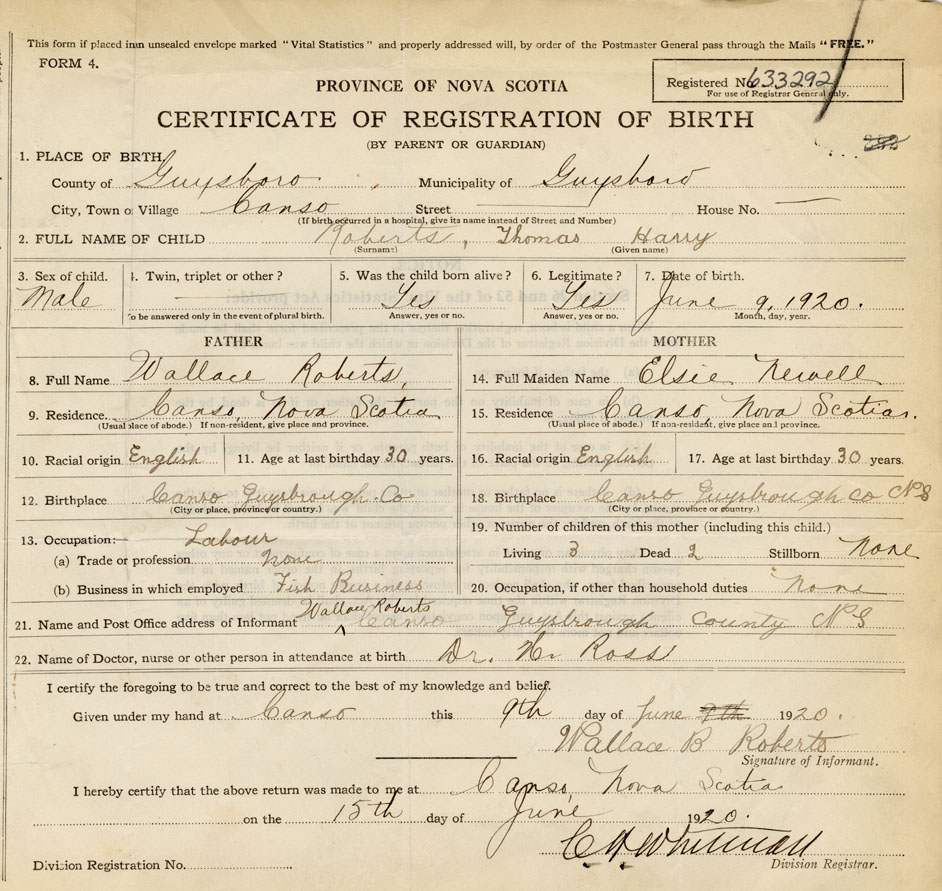 18. Birthplace Canso, Guysborough Co.