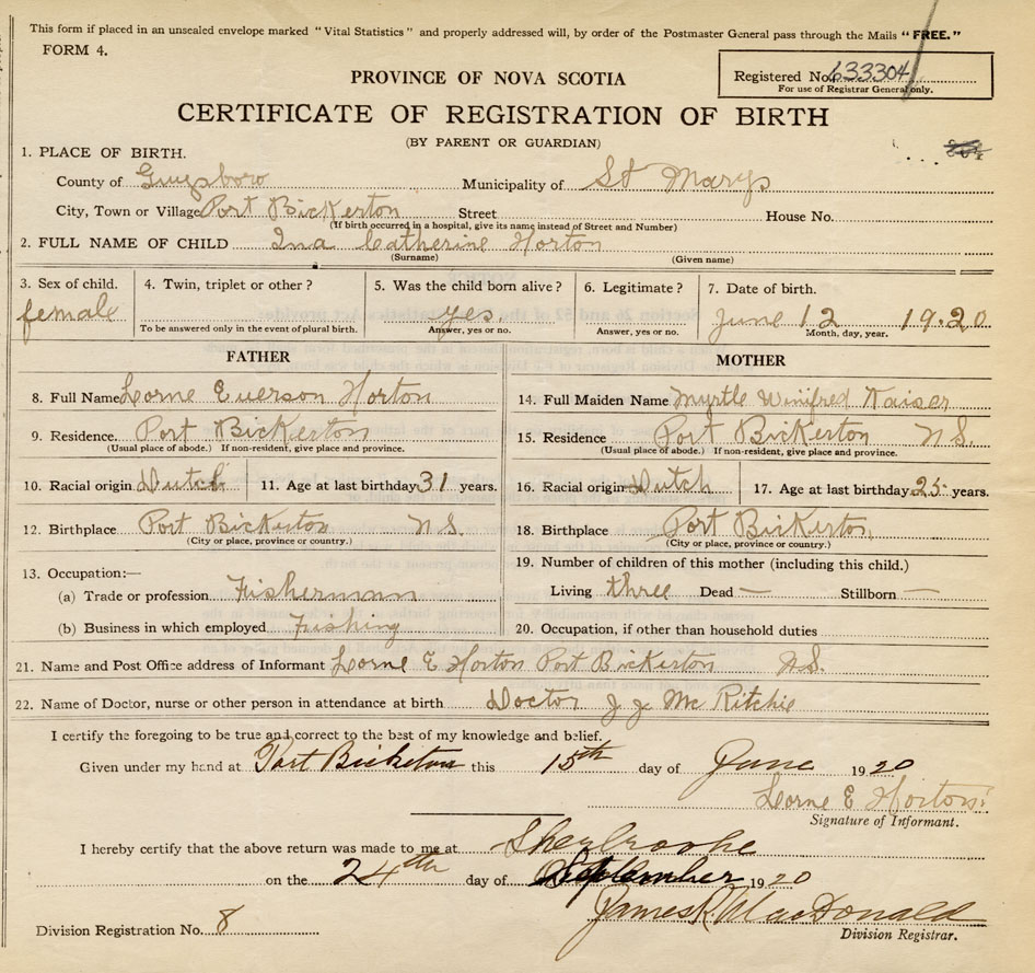 21. Name and Post Office address of Informant Lorne E. Horton Port Bickerton, Guysborough Co.