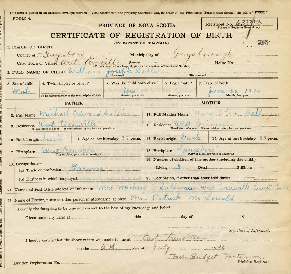 21. Name and Post Office address of Informant Mrs. Michael E. Sullivan West Erinville, Guysborough Co.