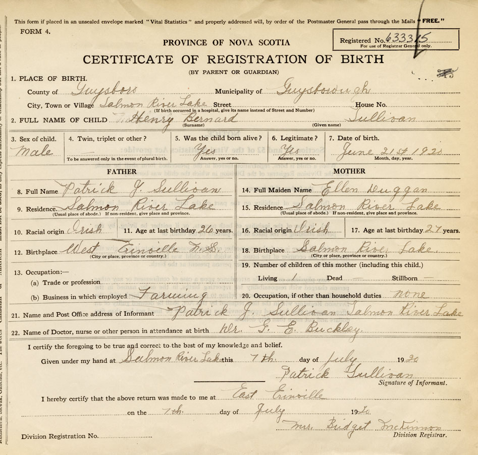 21. Name and Post Office address of Informant Patrick J. Sullivan Salmon River Lake, Guysborough Co.