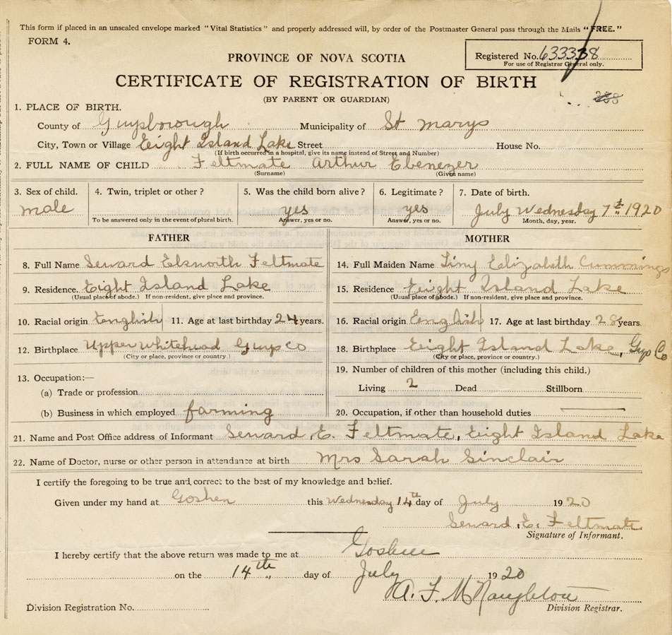 21. Name and Post Office address of Informant Seward E. Feltmate Eight Island Lake