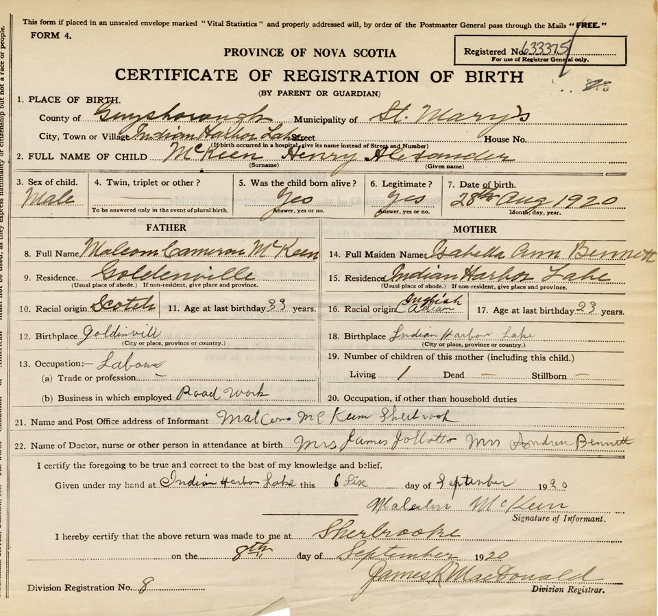 21. Name and Post Office address of Informant Malcom McKeen Sherbrooke
