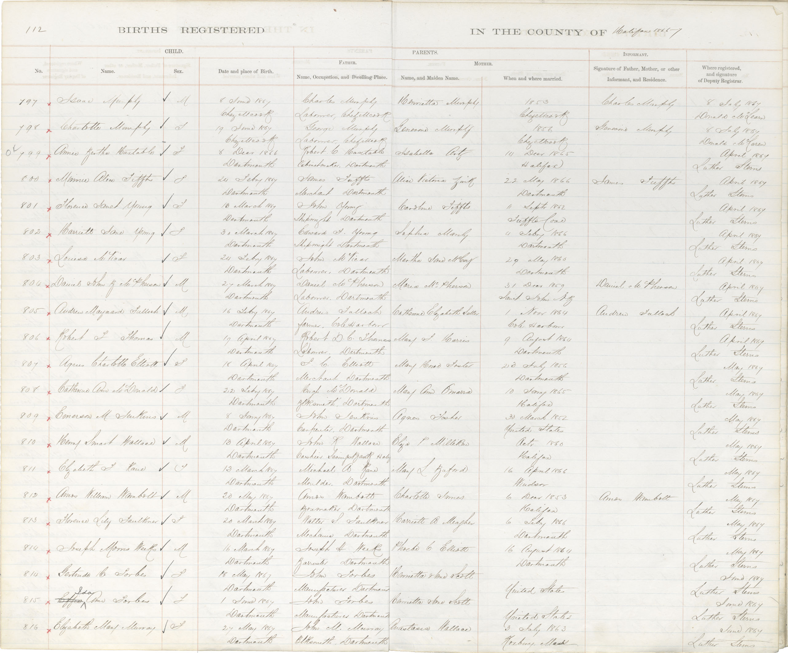 Birth Registration: Year: 1867 book: 1809 page: 112 number: 797