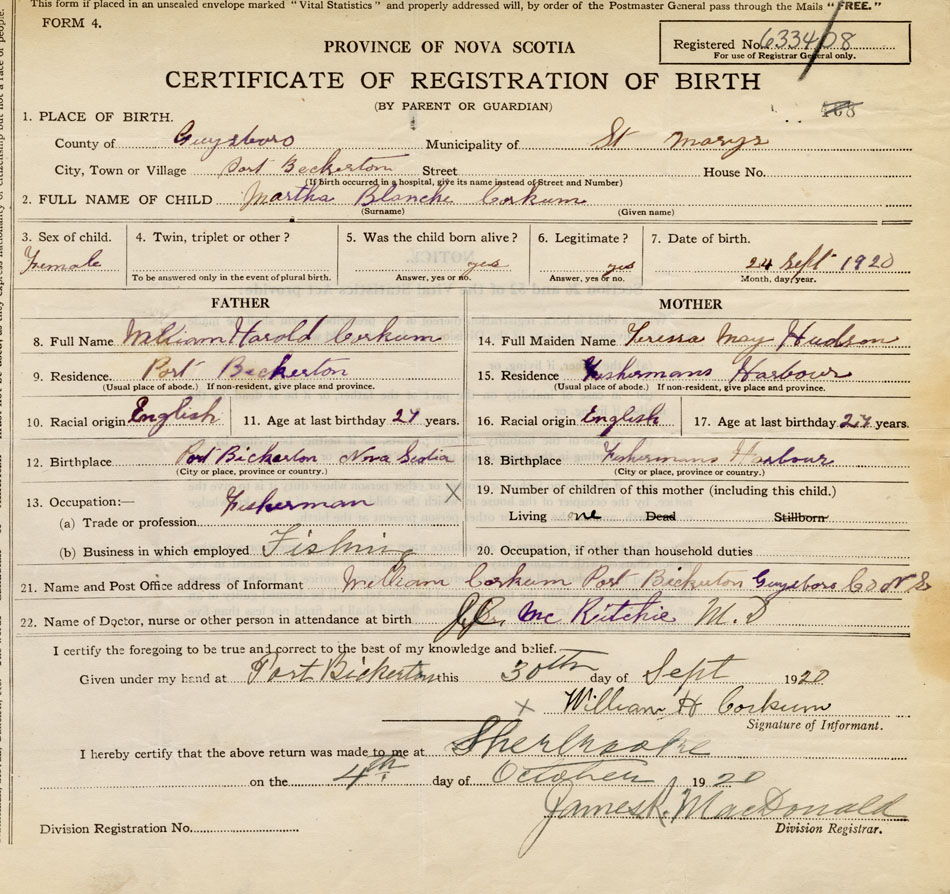 21. Name and Post Office address of Informant William H. Corkum Port Bickerton, Guysboro Co.