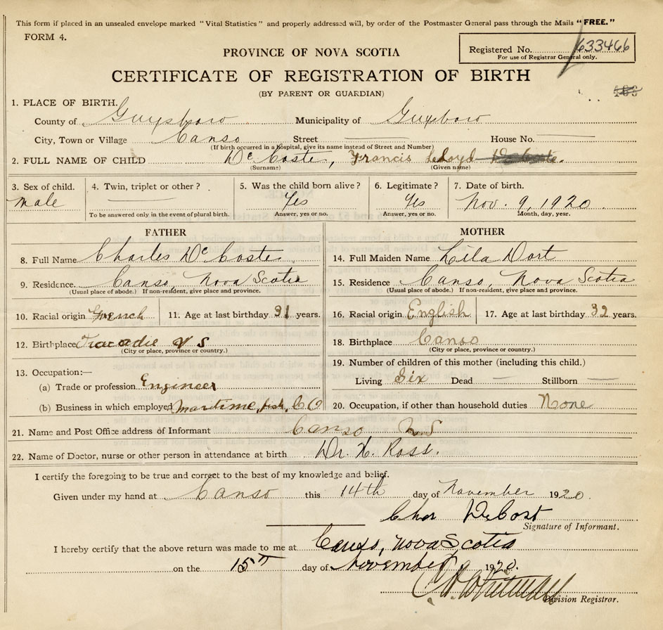 21. Name and Post Office address of Informant Charles DeCoste Canso N.S.
