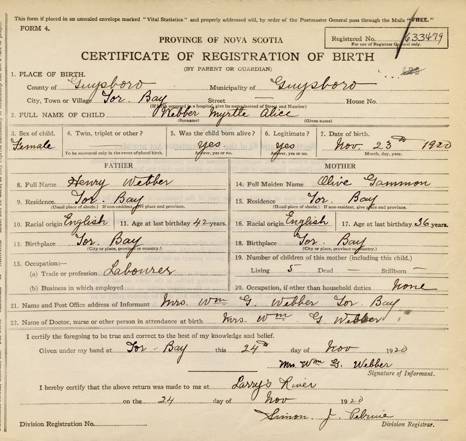 21. Name and Post Office address of Informant Mrs. William G. Webber Tor Bay, Guysborough Co.