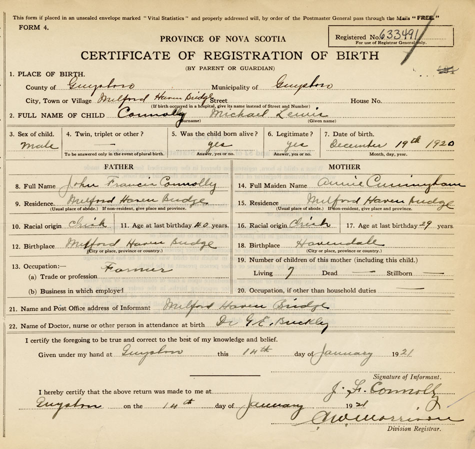 21. Name and Post Office address of Informant Melford Haven Bridge, Guysborough Co.