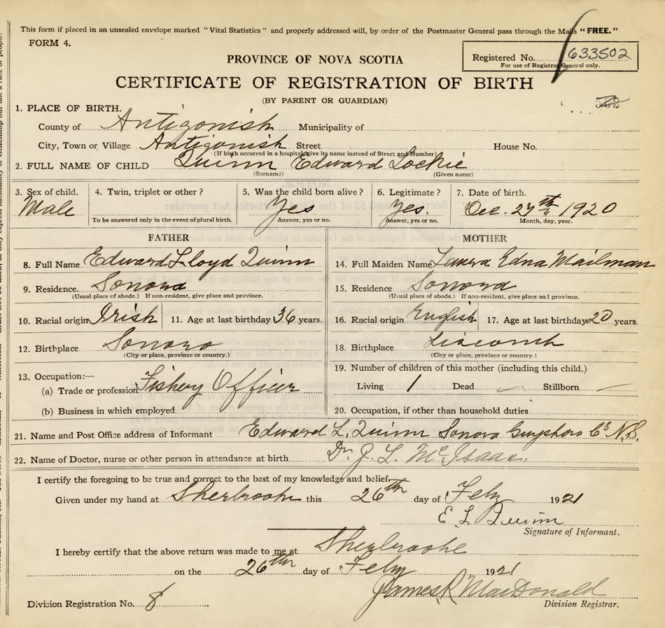 21. Name and Post Office address of Informant Edward L. Quinn Sonora, Guysboro Co. N.S.