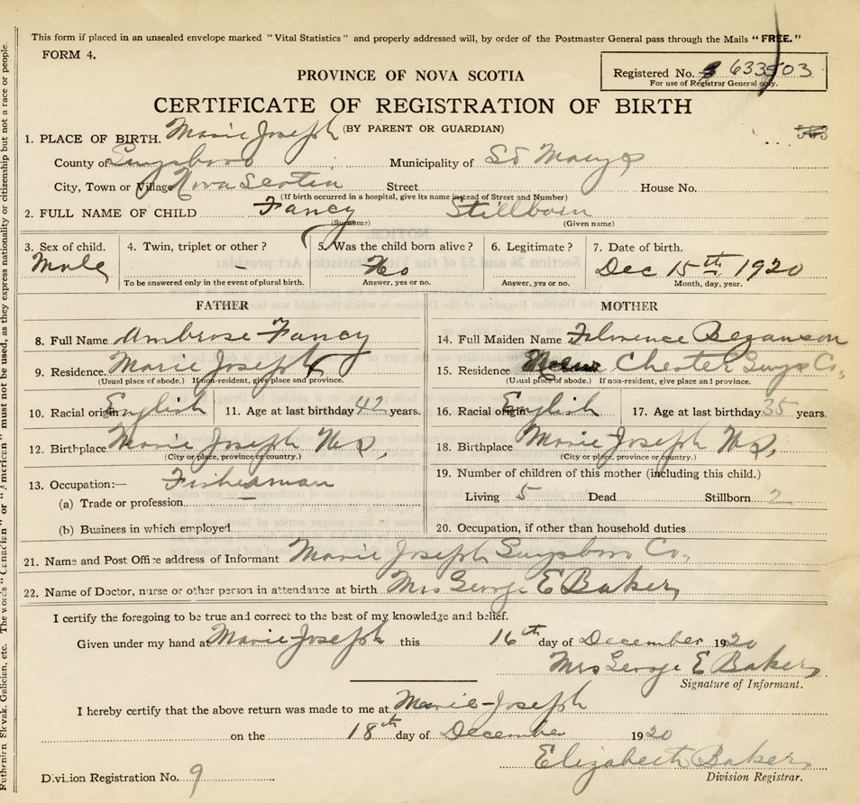 21. Name and Post Office address of Informant Mrs. George E. Baker Marie Joseph, Guysboro Co.