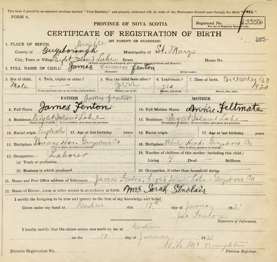 21. Name and Post Office address of Informant Jame Fenton Eight Island Lake, Guysboro Co.
