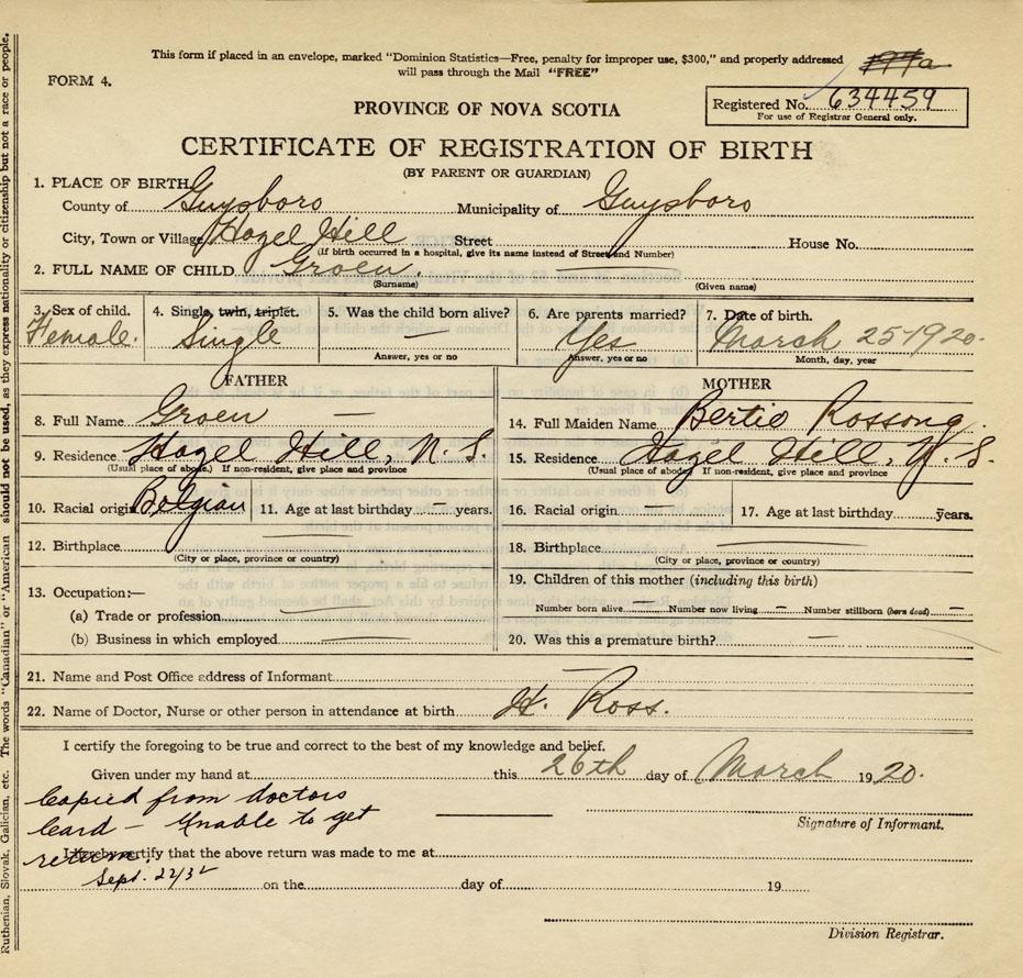 Female Birth Registration: Year: 1920 number: 63400459