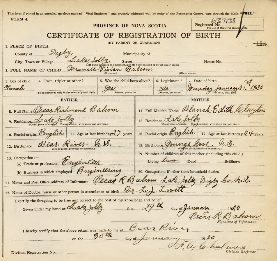 21. Name and Post Office address of Informant Oscar R. Balcom Lake Jolly, Digby Co.