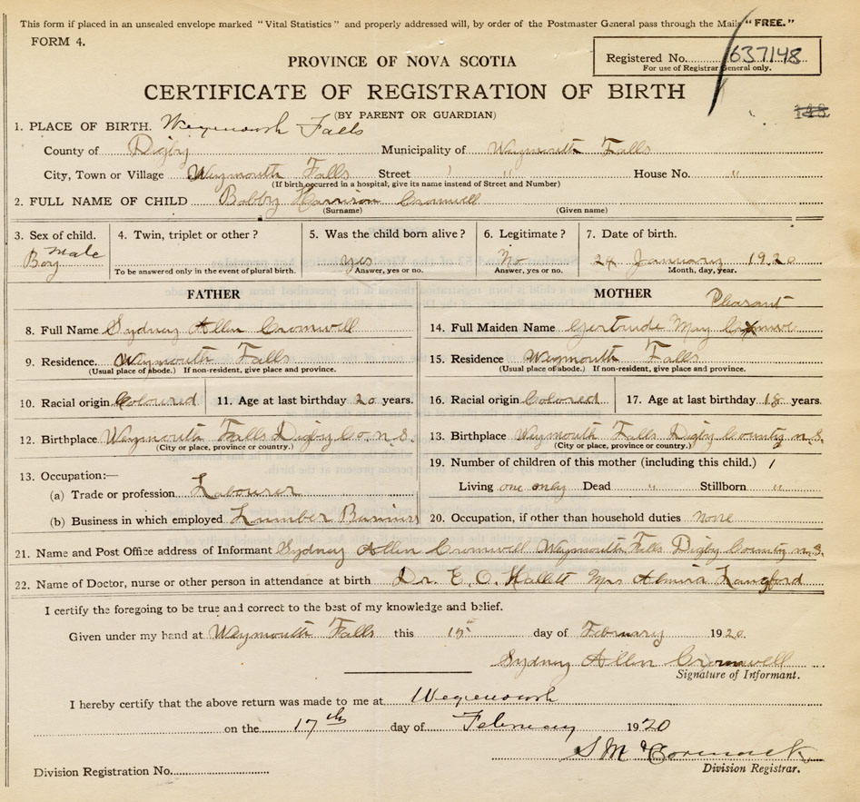 21. Name and Post Office address of Informant Sydney Allen Cromwell Weymouth Falls, Digby County