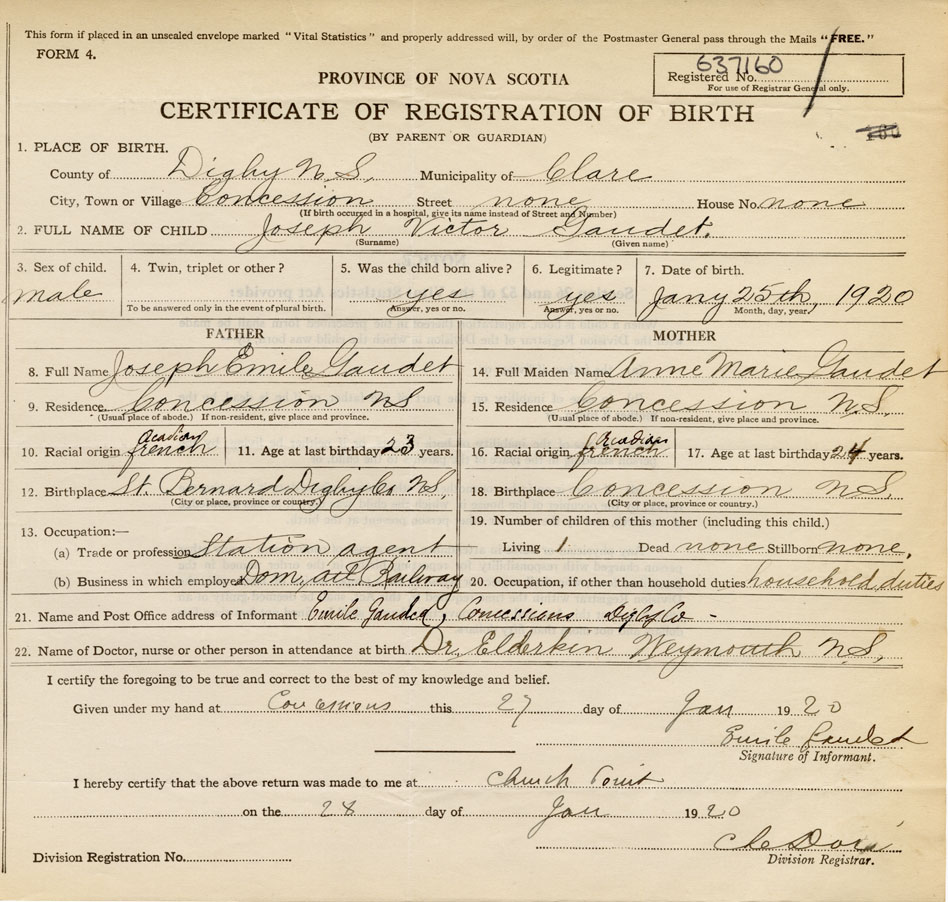 21. Name and Post Office address of Informant Emile Gaudet Concession, Digby Co.