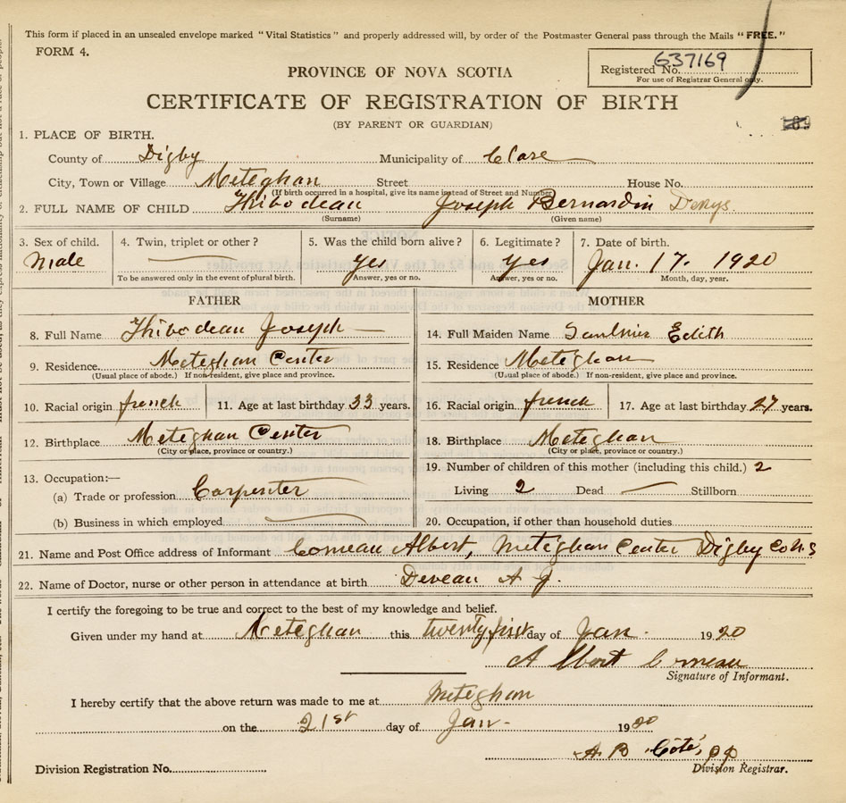21. Name and Post Office address of Informant Comeau, Albert Meteghan Center, Digby Co. N.S.