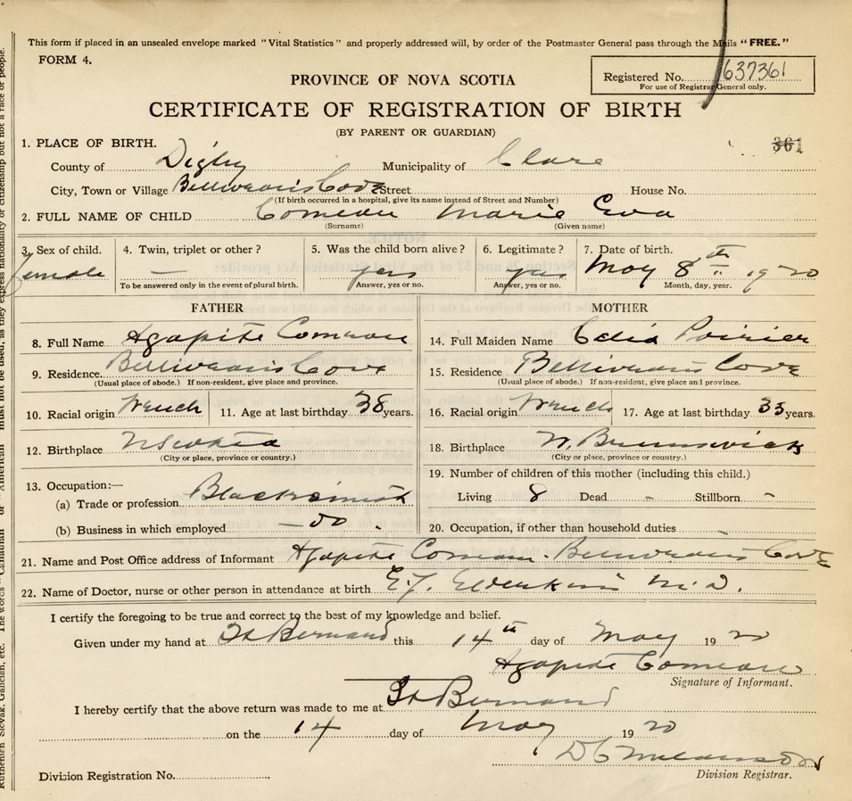 21. Name and Post Office address of Informant Agapite Comeau Belliveaus Cove