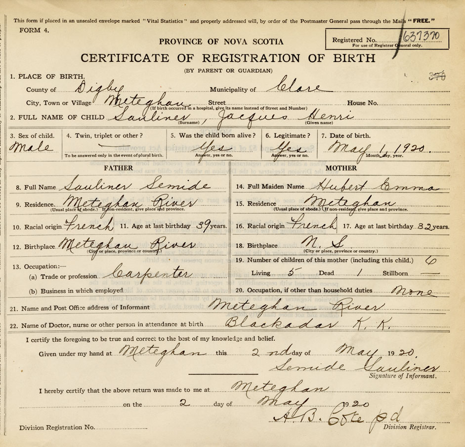 21. Name and Post Office address of Informant Semide Saulnier Meteghan River