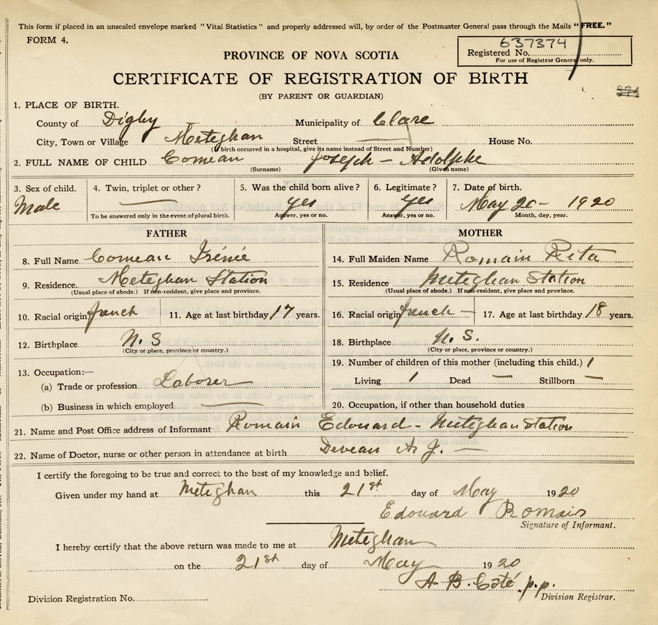 21. Name and Post Office address of Informant Edouard Romain Meteghan Station