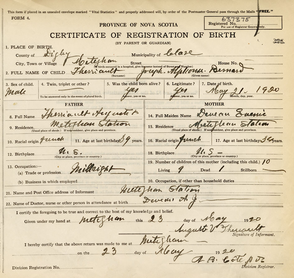 21. Name and Post Office address of Informant Auguste V. Therriault Meteghan Station