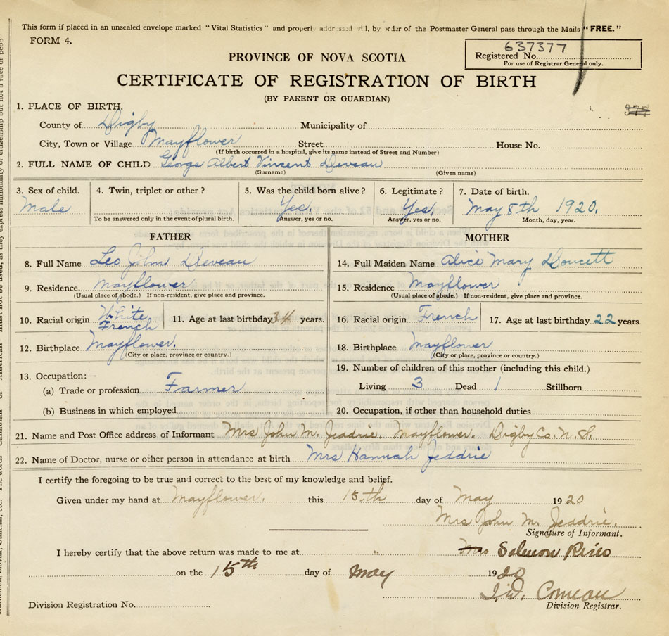 21. Name and Post Office address of Informant Mrs. John M. Jeddrie Mayflower, Digby Co.