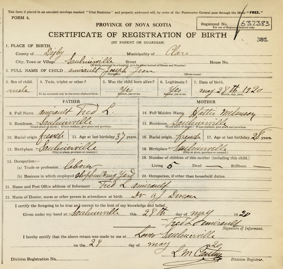 22. Name of Doctor, nurse or other person in attendance at birth Dr. A.J. Deveau
