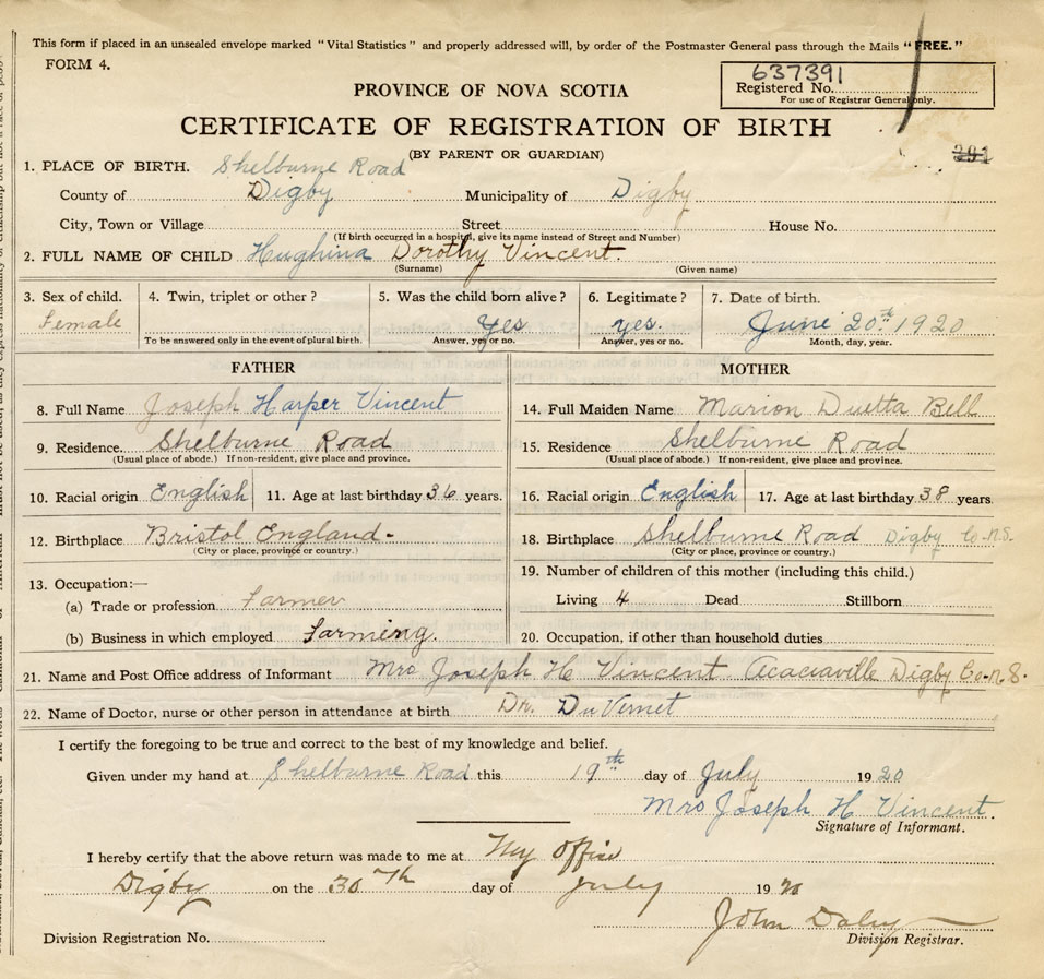 21. Name and Post Office address of Informant Mrs. Joseph H. Vincent Acaciaville, Digby Co.