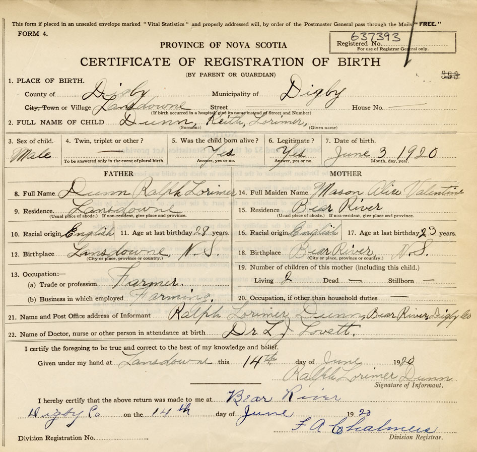 21. Name and Post Office address of Informant Ralph Lorimer Dunn Bear River, Digby Co.