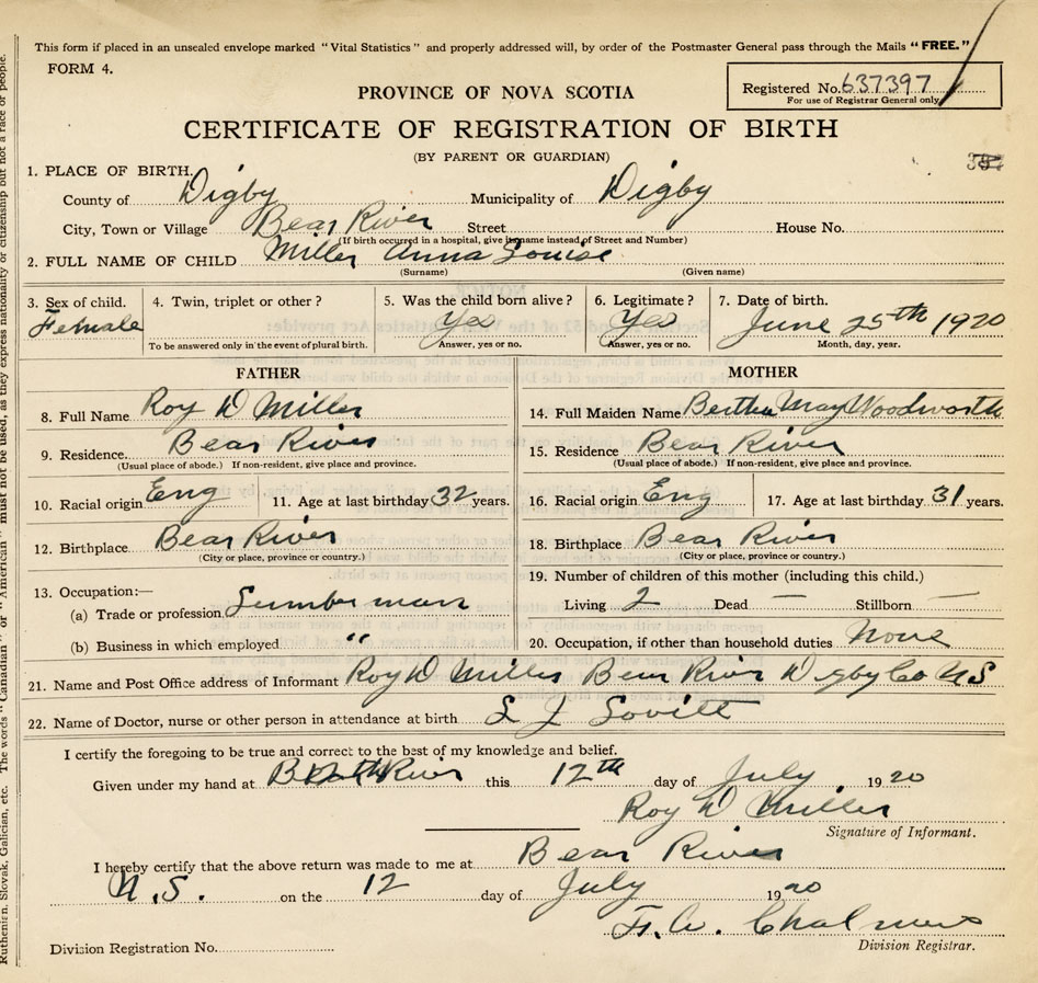 21. Name and Post Office address of Informant Roy D. Miller Bear River, Digby Co.