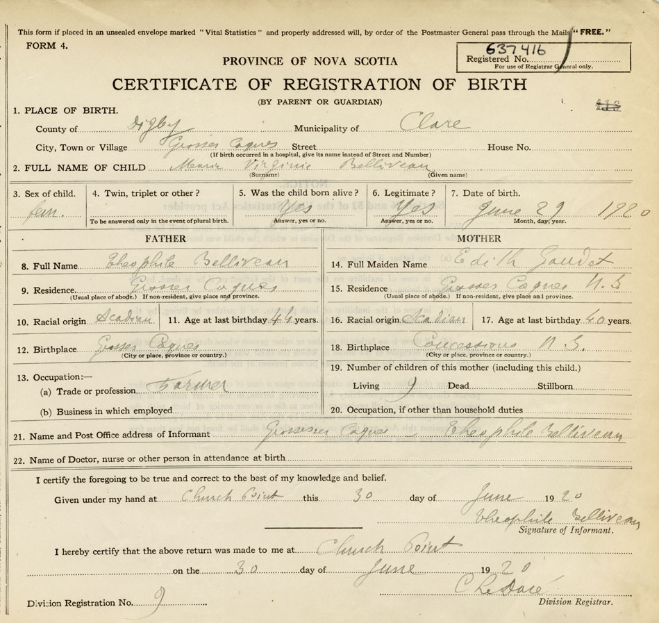 21. Name and Post Office address of Informant Theophile Belliveau Grosses Coques