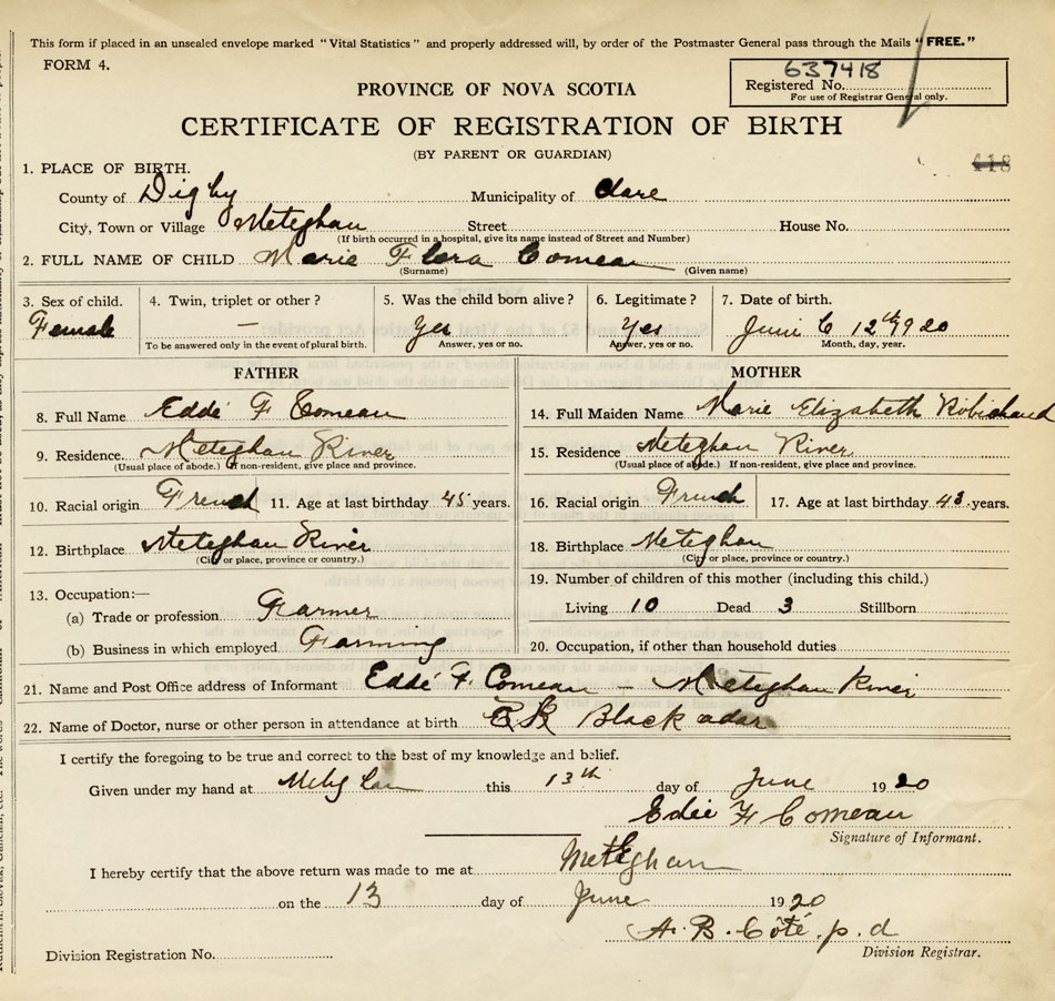 21. Name and Post Office address of Informant Edde F. Comeau Meteghan River