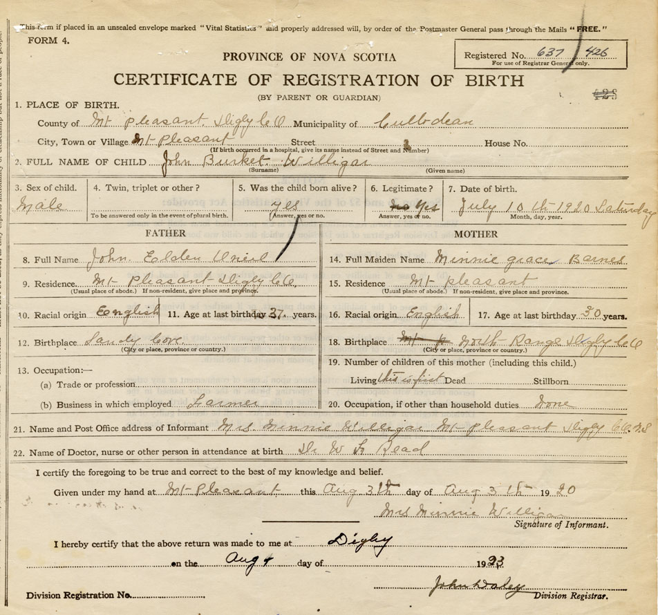 21. Name and Post Office address of Informant Mrs. Minnie Willigar Mt. Pleasant, Digby Co.