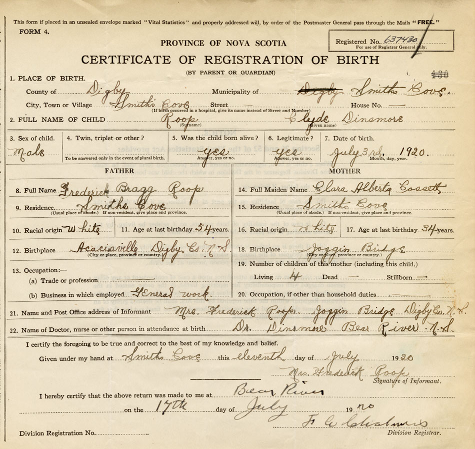 21. Name and Post Office address of Informant Mrs. Frederick Roop Joggin Bridge, Digby Co. N.S.