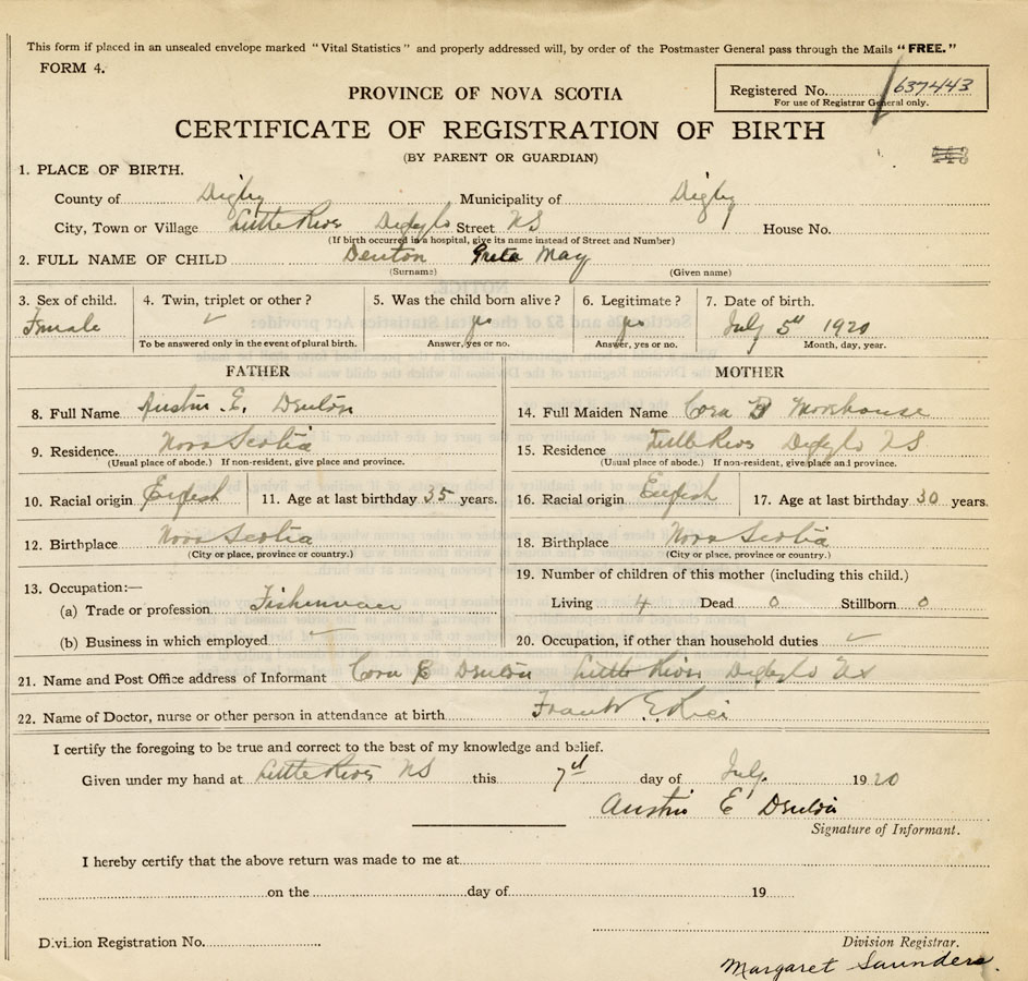 21. Name and Post Office address of Informant Austin E. Denton Little River, Digby Co.