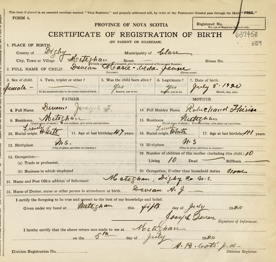 21. Name and Post Office address of Informant Joseph L. Deveau Meteghan, Digby Co. N.S.