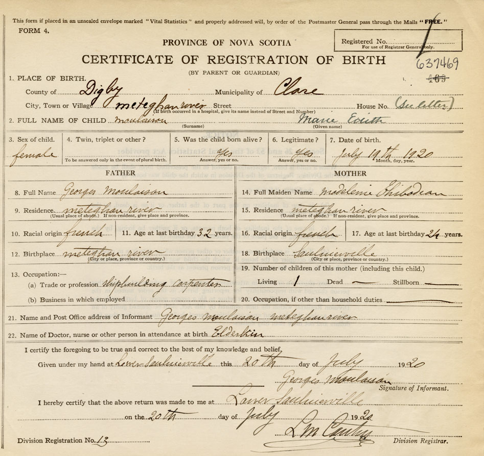 21. Name and Post Office address of Informant Georges Moulaison Meteghan River