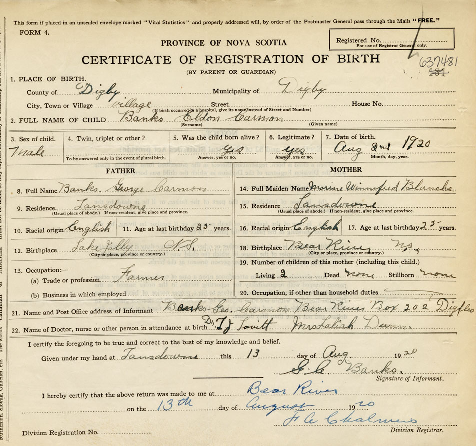 21. Name and Post Office address of Informant Geo. Carmon Banks Bear River, Box 202, Digby Co.