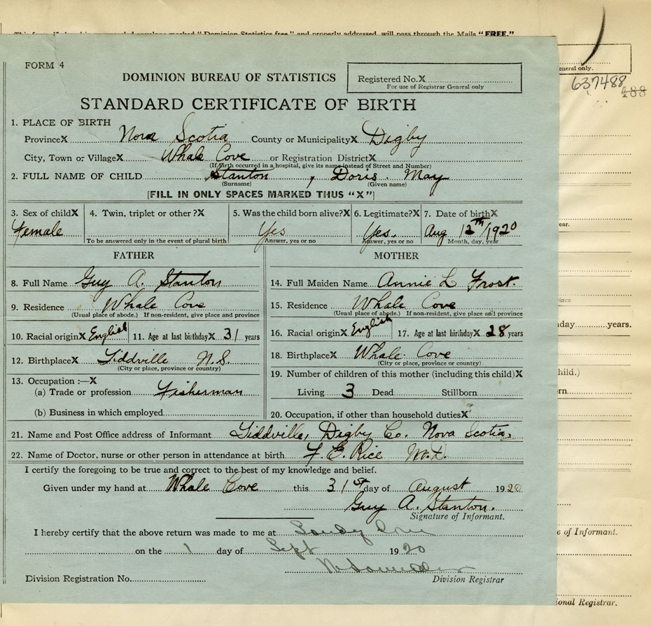 21. Name and Post Office address of Informant Guy A. Stanton Tiddville, Digby Co., Nova Scotia